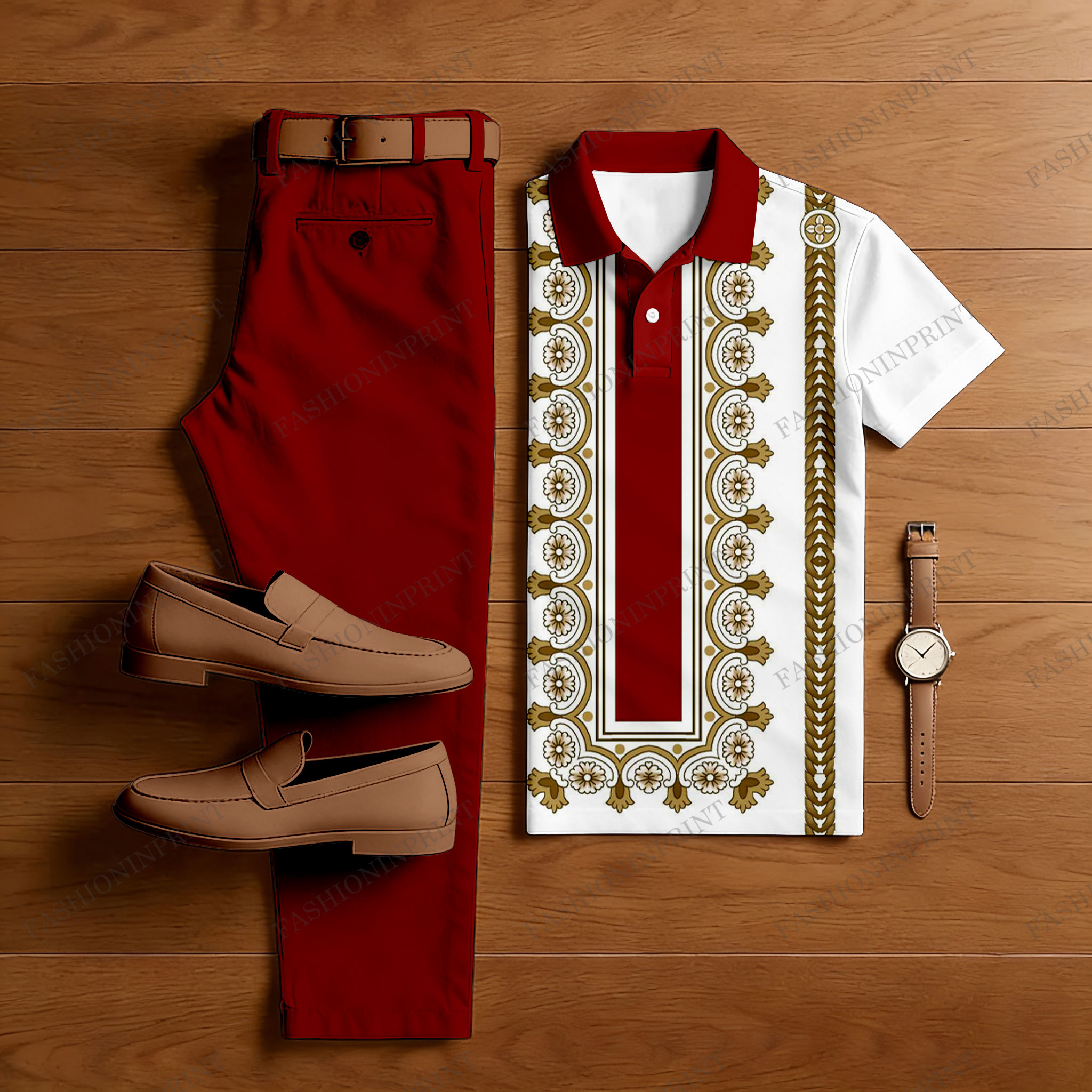 Men's Casual White & Red Color Matching Baroque Style Printed Short Sleeved Polo Shirt & Trousers Two-Piece Set