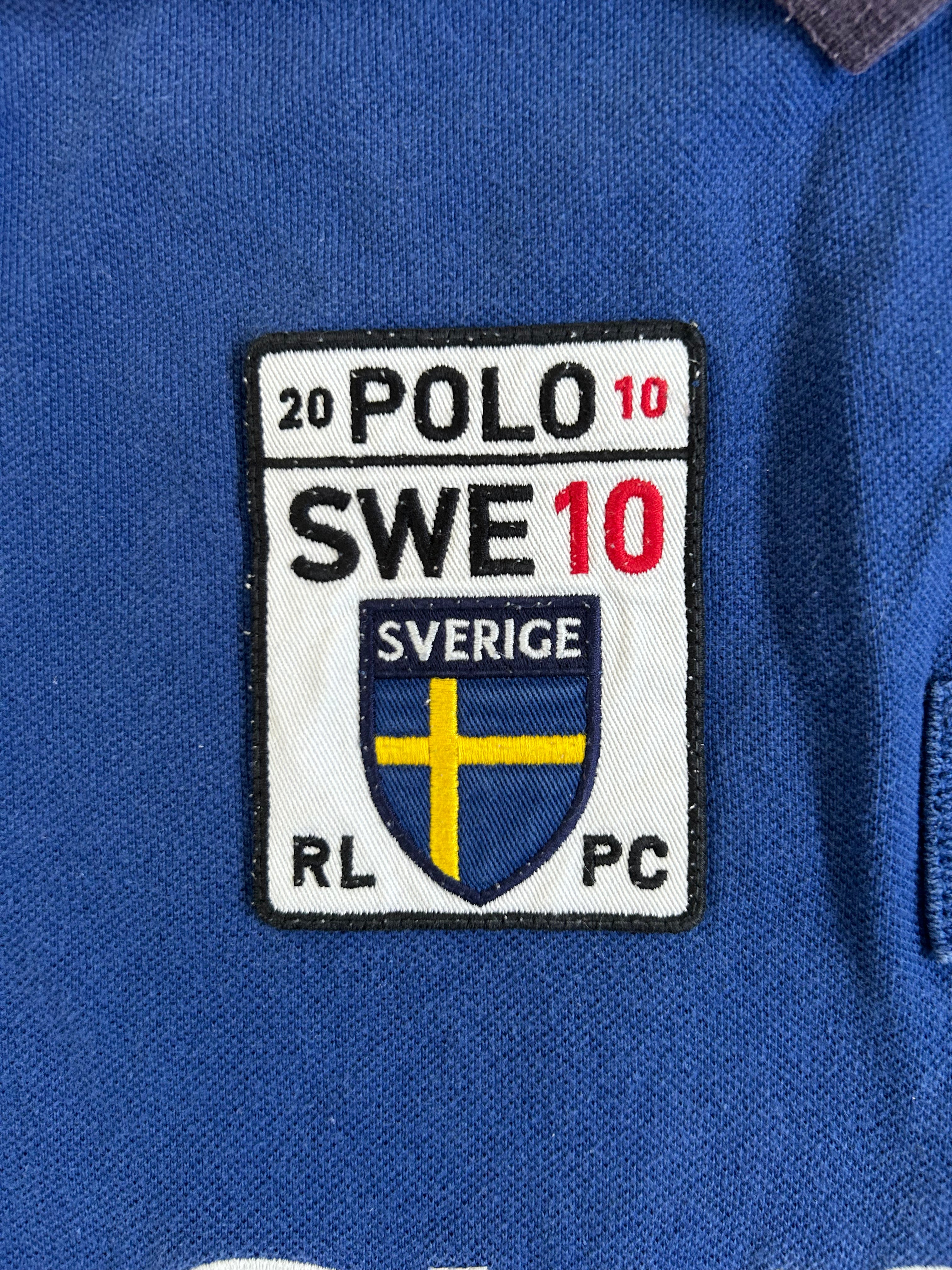 Made from 100% high-quality cotton, it features the Big Pony logo, bold "SWEDEN" lettering, an embroidered Sweden team crest, and the number 10 on both sleeves—a signature detail in Ralph Lauren’s polo designs. No longer in production, making it a rare and collectible item for Ralph Lauren enthusiasts.