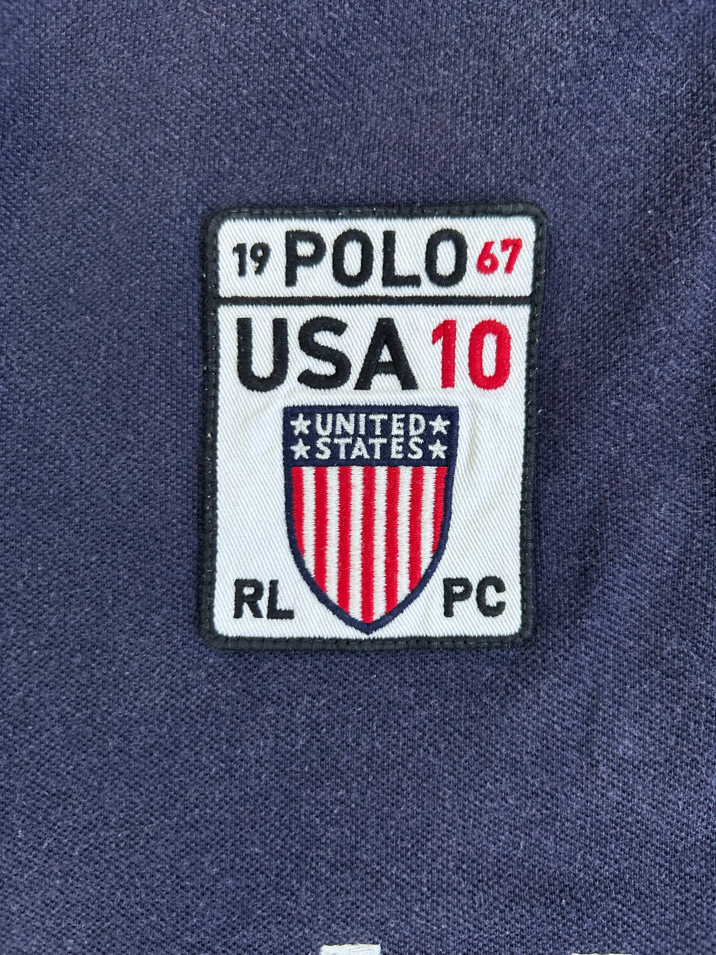 Made from 100% high-quality cotton, it features the Big Pony logo, bold "USA" lettering, an embroidered USA team crest, and the number 10 on both sleeves—a signature detail in Ralph Lauren’s polo designs. No longer in production, making it a rare and collectible item for Ralph Lauren enthusiasts.