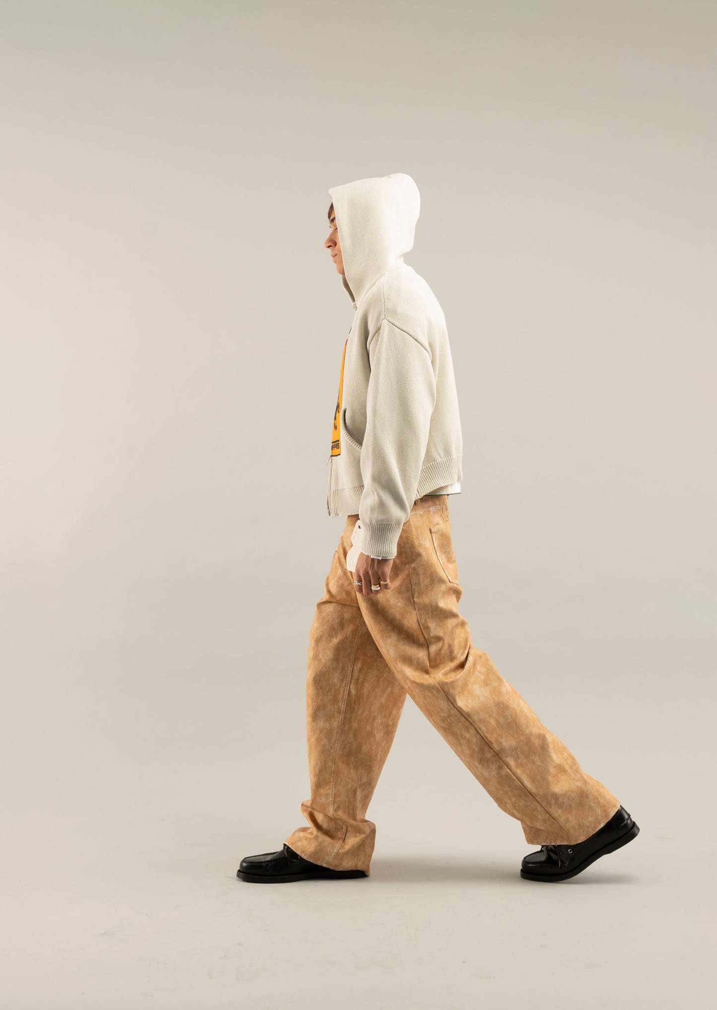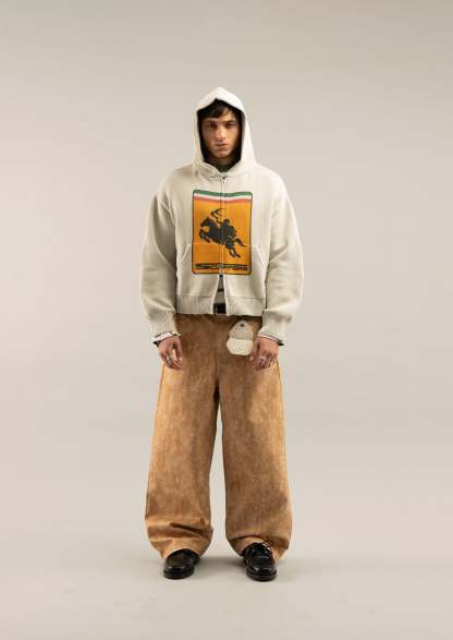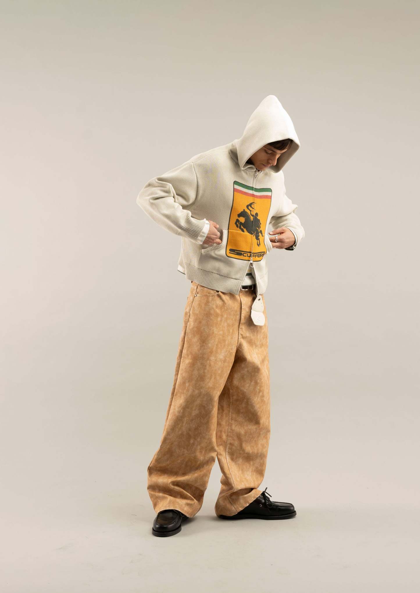 Ecru zip-up knitwear with a bold equestrian-inspired Scuffers graphic on the front, accented with a tricolor stripe detail. Features a hood, front kangaroo pocket, and ribbed cuffs and hem for a snug fit. Made from soft, midweight fabric with a slightly faded finish for a vintage look. Full-length zip closure with ring pull.