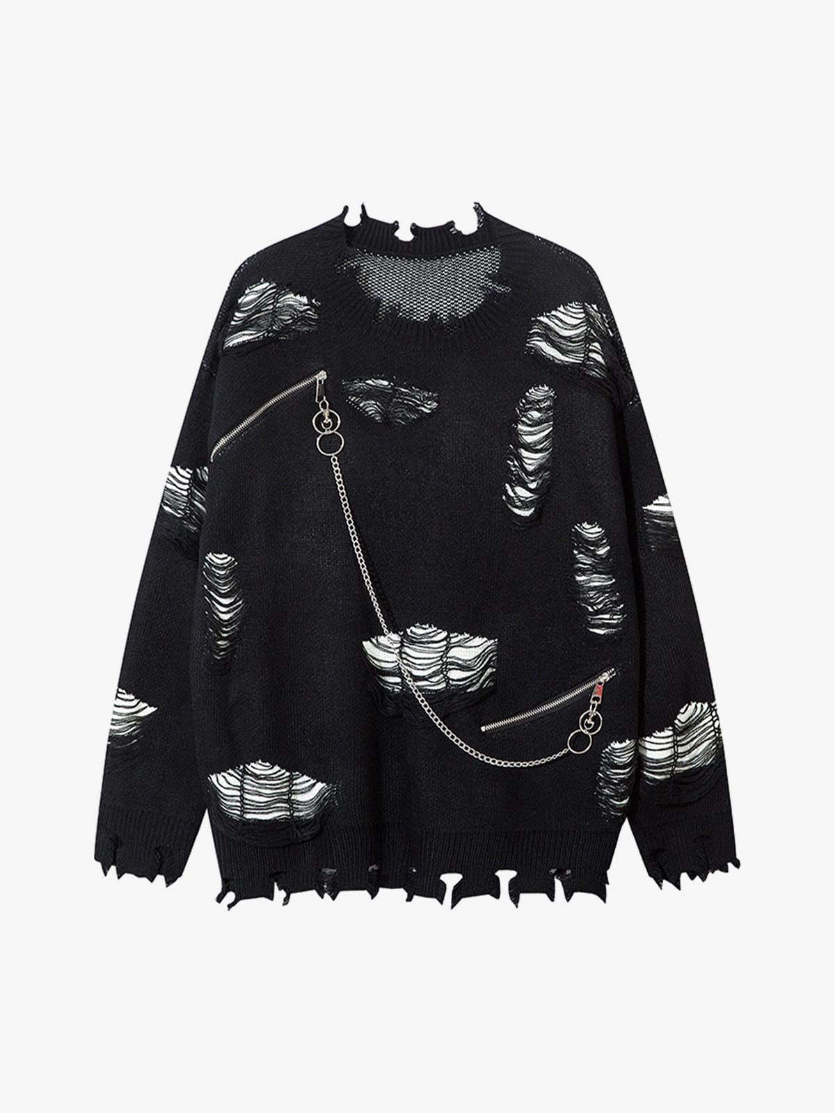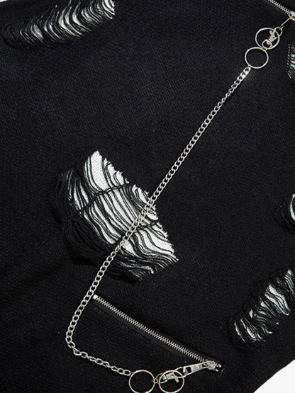 • Design Elements: Distressed holes, chain accessory, zippered details