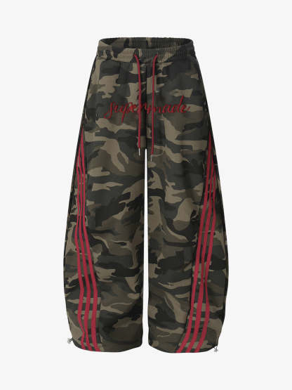 • Design Elements: Camouflage Print, Red Side Stripes, Embroidered Logo