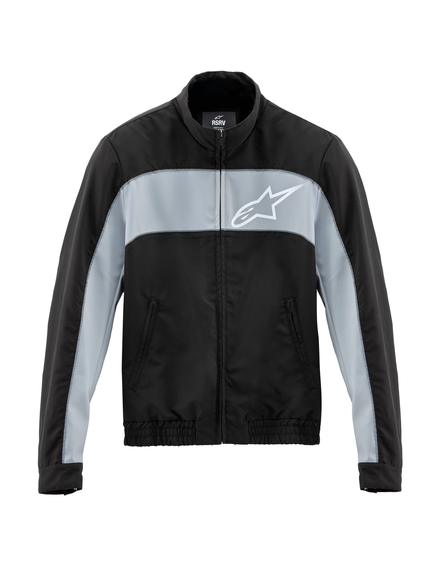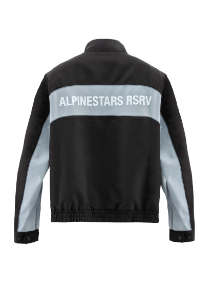 The Track Jacket is an homage to Alpinestars early leather motorcycle suits of the early 2000s as much as it is a nod to the classic tracksuit. Built from a deadstock microfiber fabric, the jacket bears black and gray color blocking, reflective piping, a mock neck, and a full zip, referencing Alpinestars early race suit styling. RSRV logo is emblazoned across the back and the Astar logo adorns the chest, further referencing its race suit lineage. The classic relaxed fit gives premium casual styling wedged somewhere between resort and race paddock. A matching track pant is also available, sold separately.
