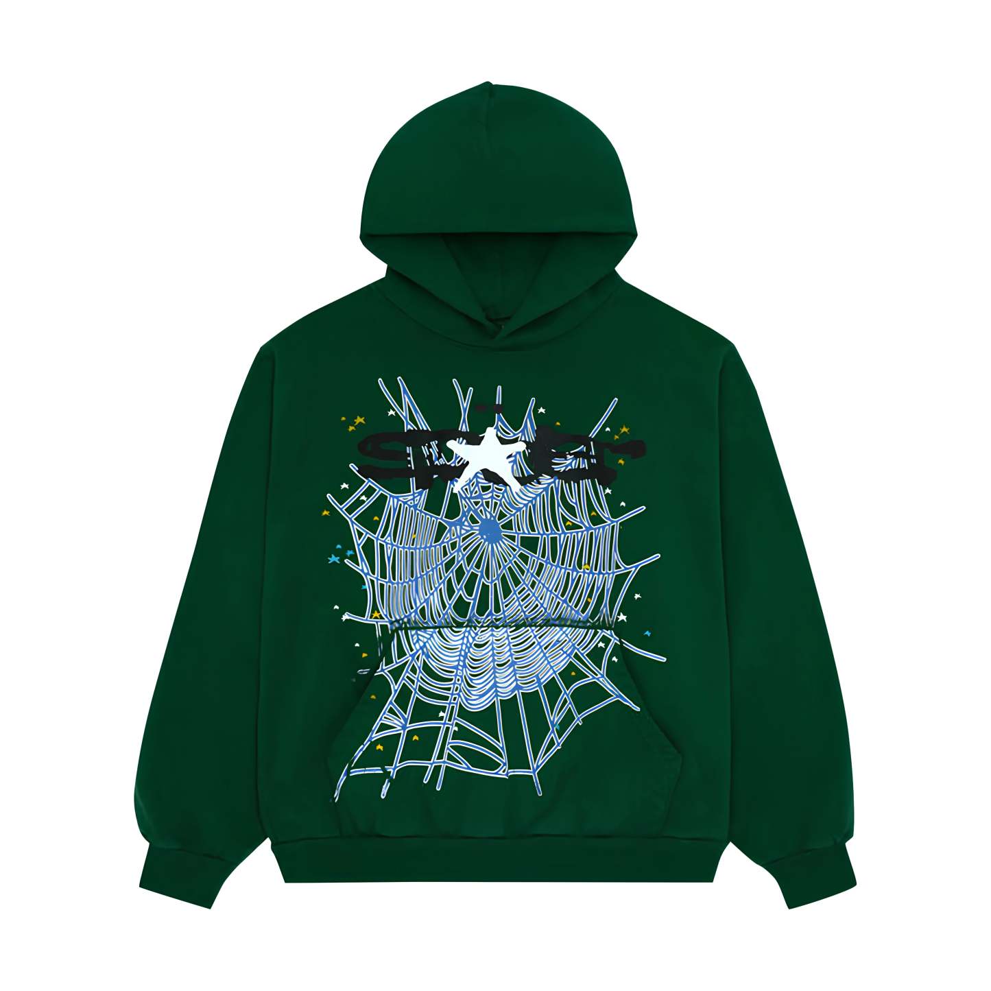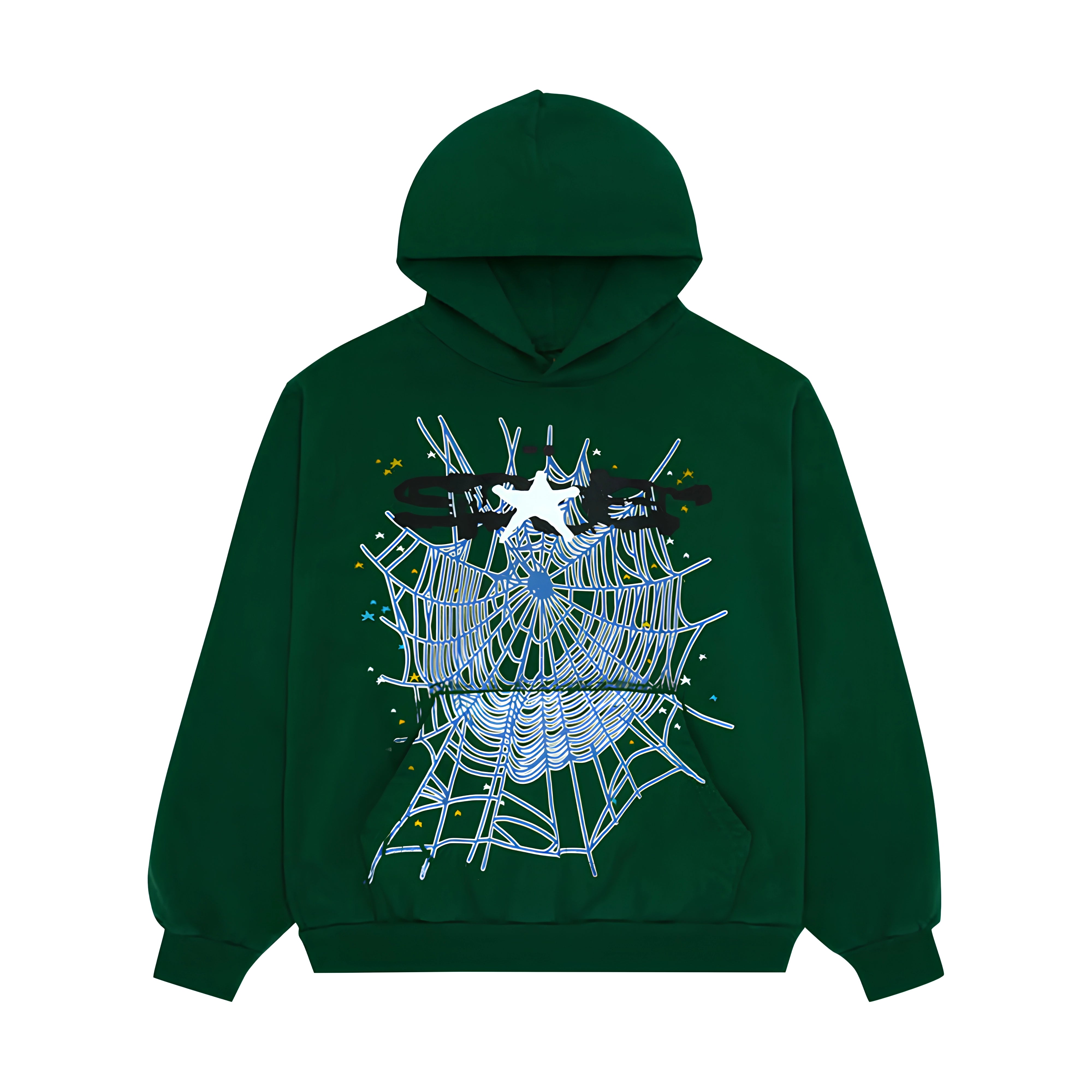 The Sp5der Web Hoodie hunter green features a bold design with its signature web pattern and deep green hue. Founded by Young Thug, the brand is worn by celebrities like IShowSpeed and Central Cee, cementing its influence in the streetwear universe.