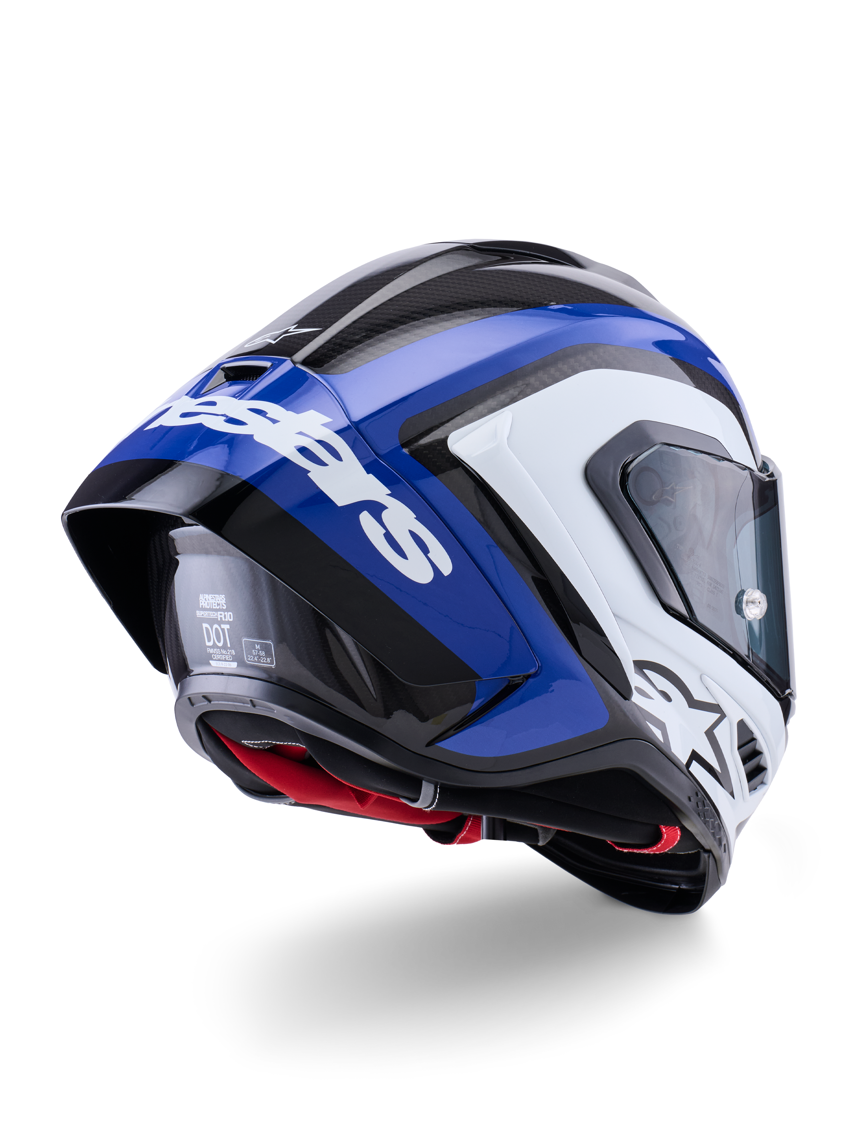 Developed over a decade, the Supertech R10 is Alpinestars' most advanced race helmet, engineered for ultimate protection, aerodynamic efficiency, and lightweight performance. Rigorously tested with MotoGP champions including Andrea Dovizioso, Jorge Martin, and Jack Miller, it delivers exceptional safety and comfort through carbon construction that exceeds ECE 22.06 limits by 65% in rotational impacts. Includes two shields (clear and dark smoke), race and road spoilers, Pinlock 120XLT lens, tear-offs, wind and breath deflectors, and helmet bag.