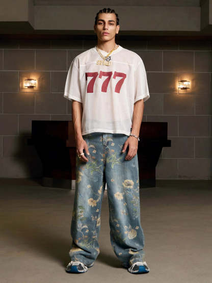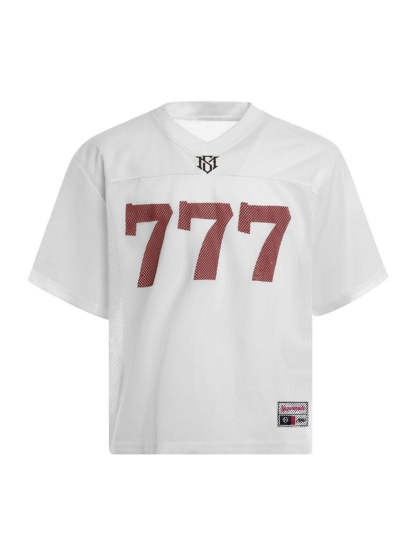 • Detail Features: Number 777 Print, V-Neck Collar, Short Sleeves, Cropped Fit