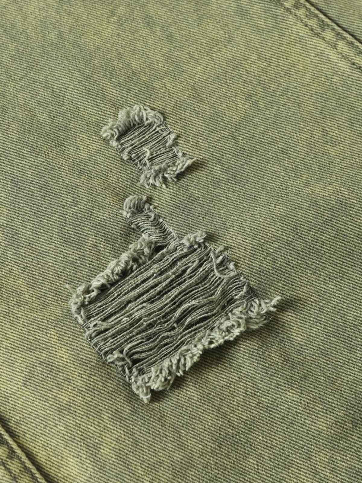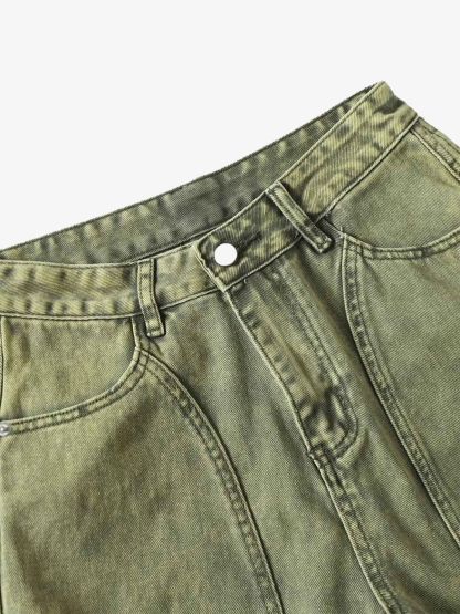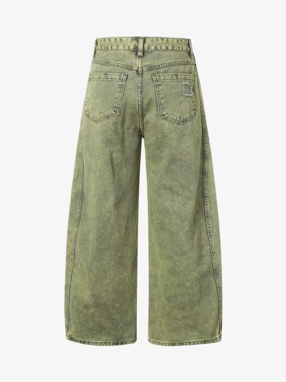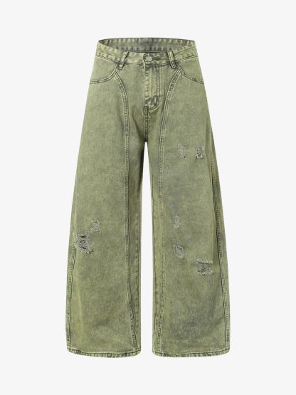 • Design Elements: Distressed details, wide-leg silhouette, high-rise waist