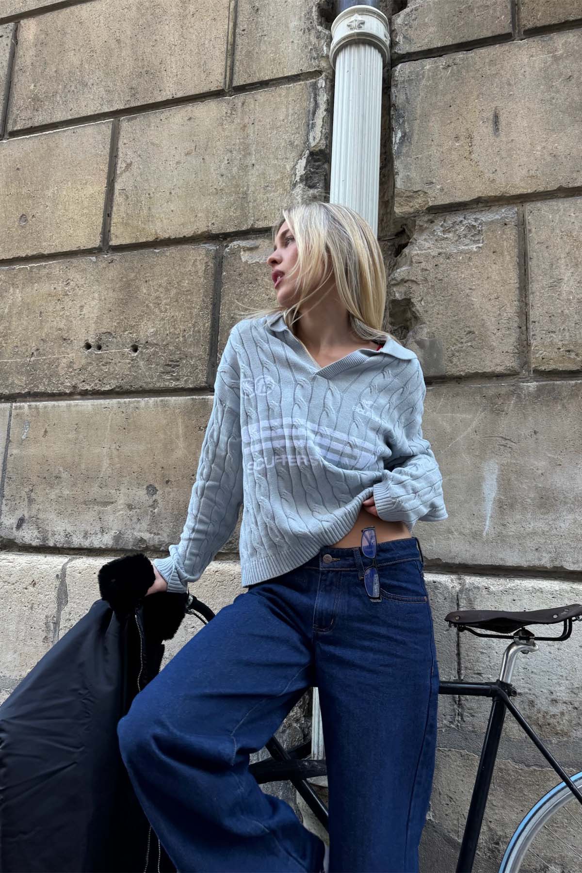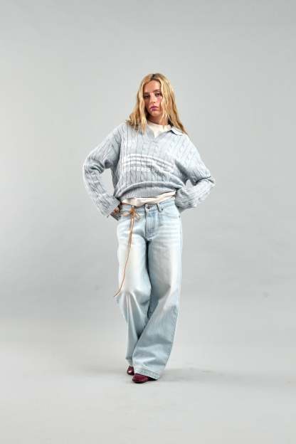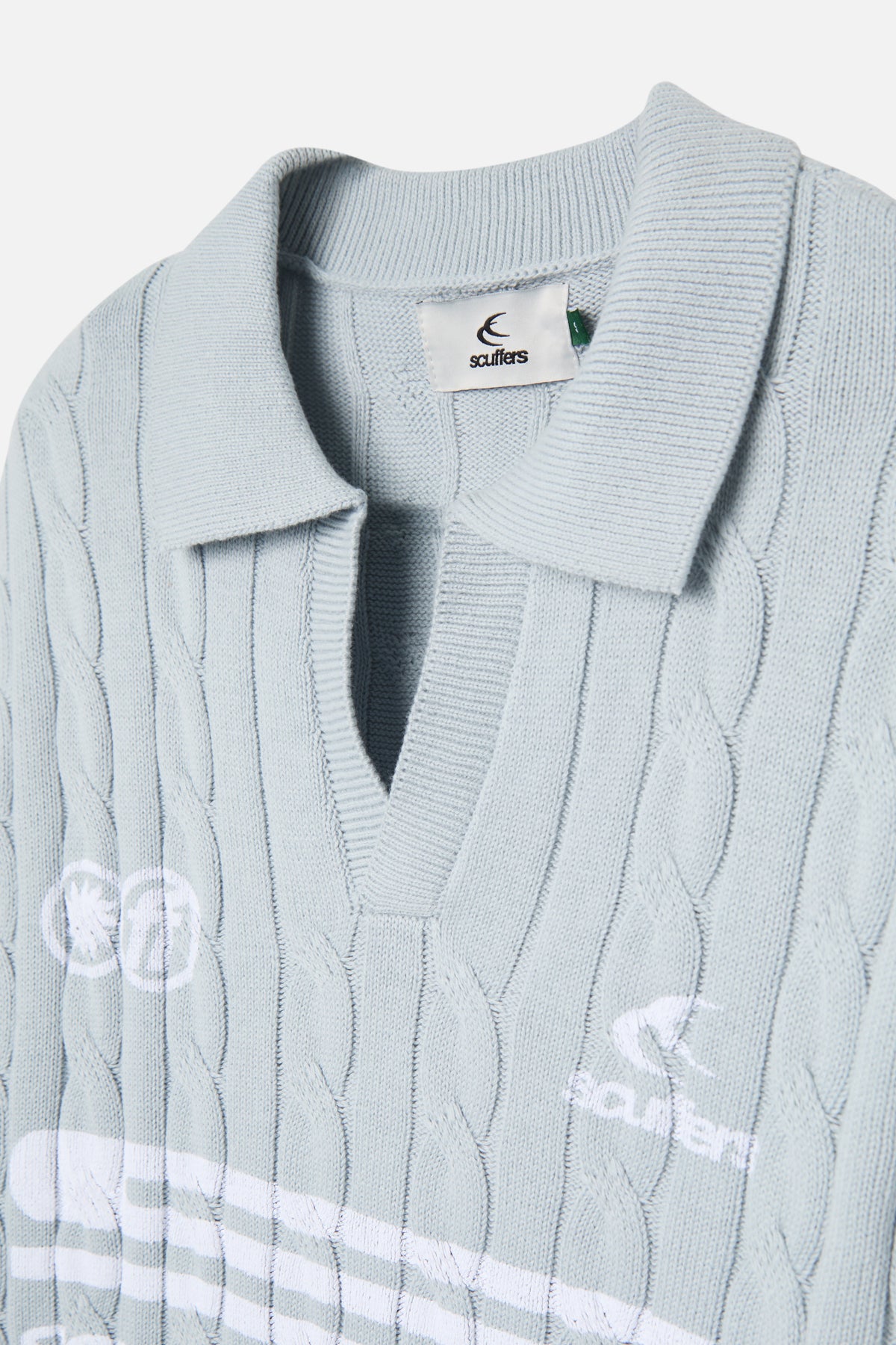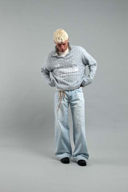 Light Blue Trench-Knit Polo Sweater crafted from soft, breathable cotton for a comfortable fit. Features a textured cable-knit design, a collared neckline with a V-placket, and ribbed cuffs and hem for structure. Contrasted with bold white graphic logos and text detailing on the front, blending a classic aesthetic with contemporary branding. Ideal for layering or standalone wear.