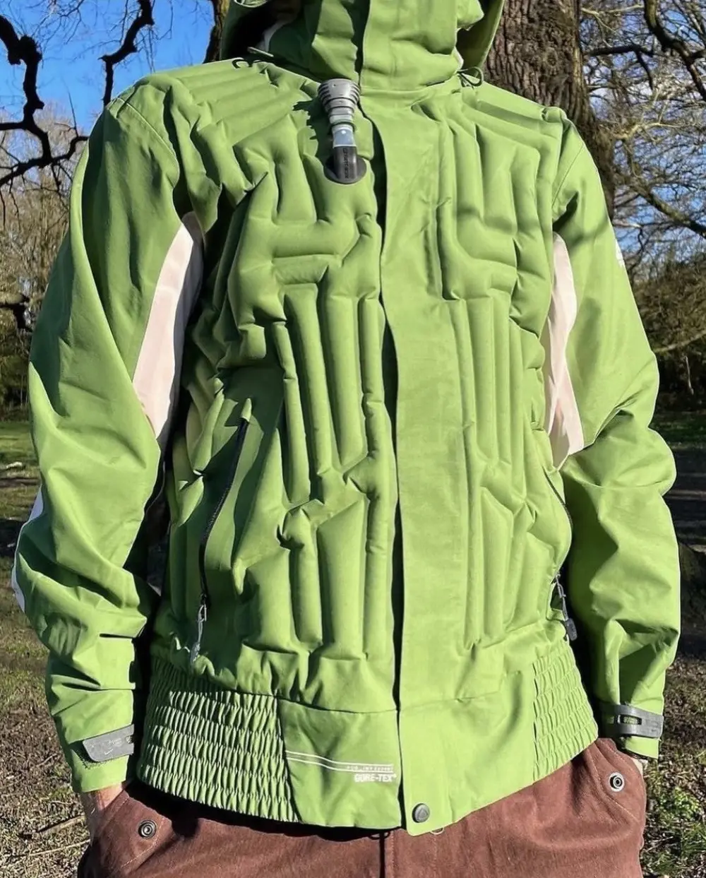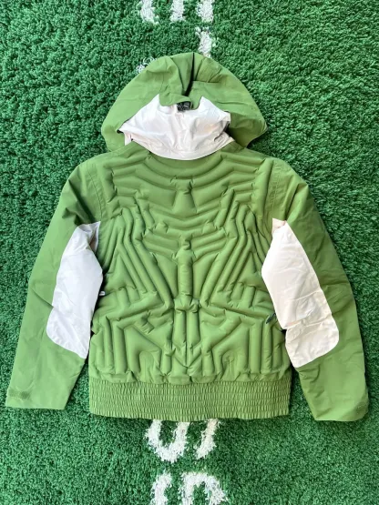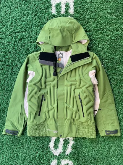 This jacket locks in insulation with manual and electric hand pumps for a customised fit. The insulation in the arms and powder skirt keeps out the cold, while the removable hood doubles as a bag for added convenience.