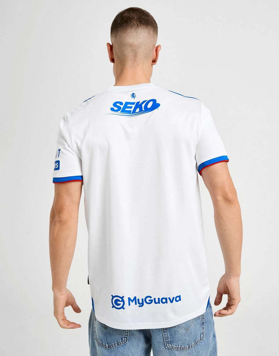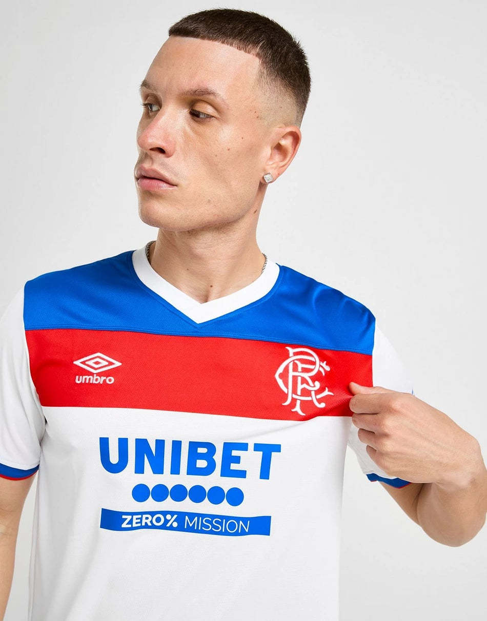 Take your Gers pride on the road with this men's Rangers FC 2025/26 Away Shirt from Umbro. The Brilliant White base features Lapis Blue and Flame Scarlet panels to the chest and on the short sleeve cuffs. It's cut with a crew neckline, a drop back hem and set in sleeves. It's cut from a breathable fabric for cool comfort when the game heats up. Finished off with a Lion crest on the nape and the Umbro logo and RFC crest on the chest. Machine washable.