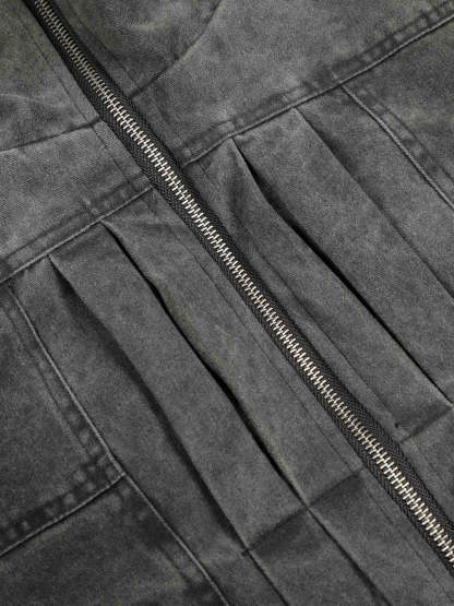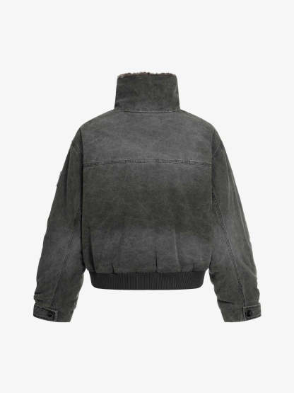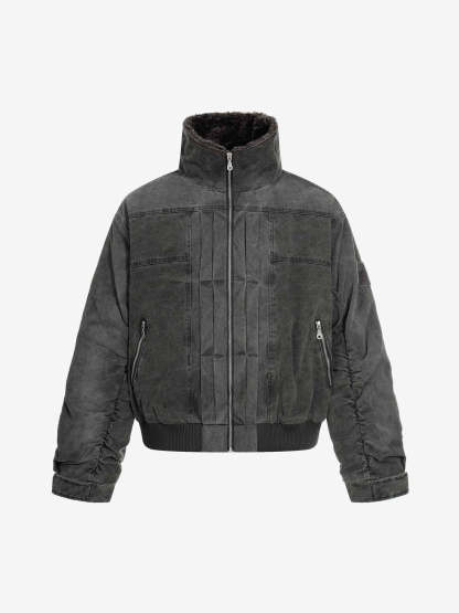 Vintage Distressed Pleated Shearling Collar Fleece Jacket