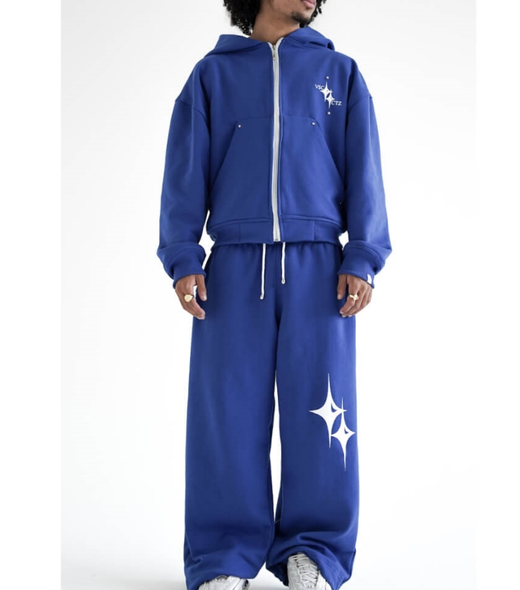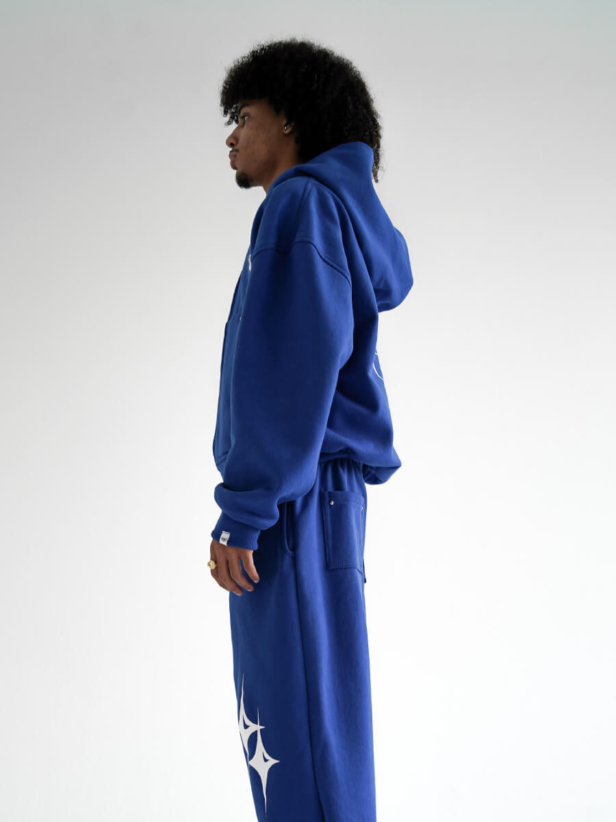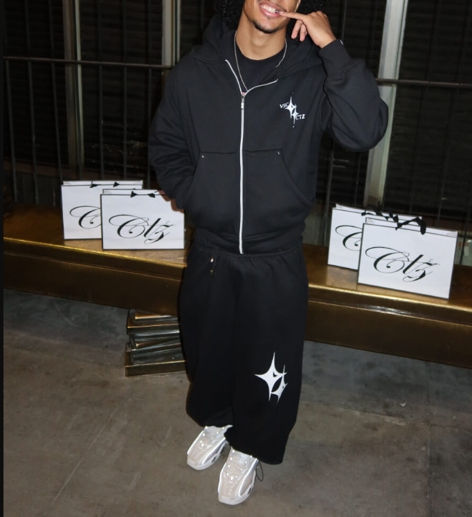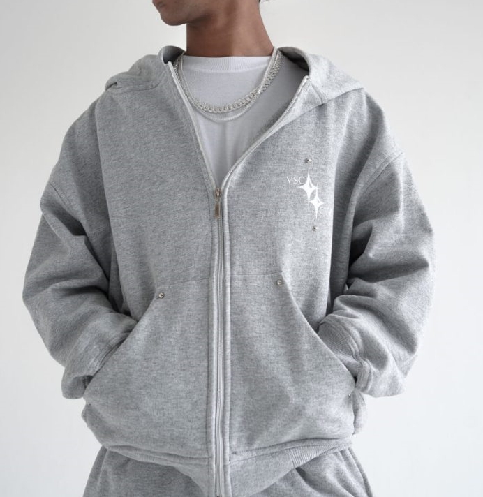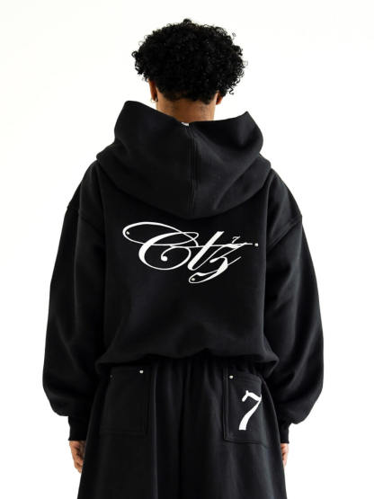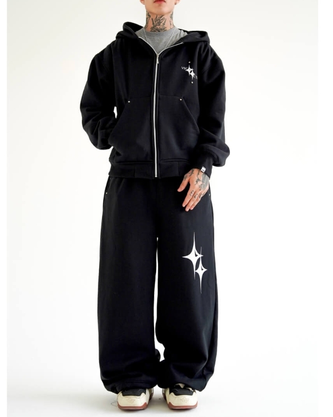 Black hoodie jacket with hood, pockets at the front and details with light dot.