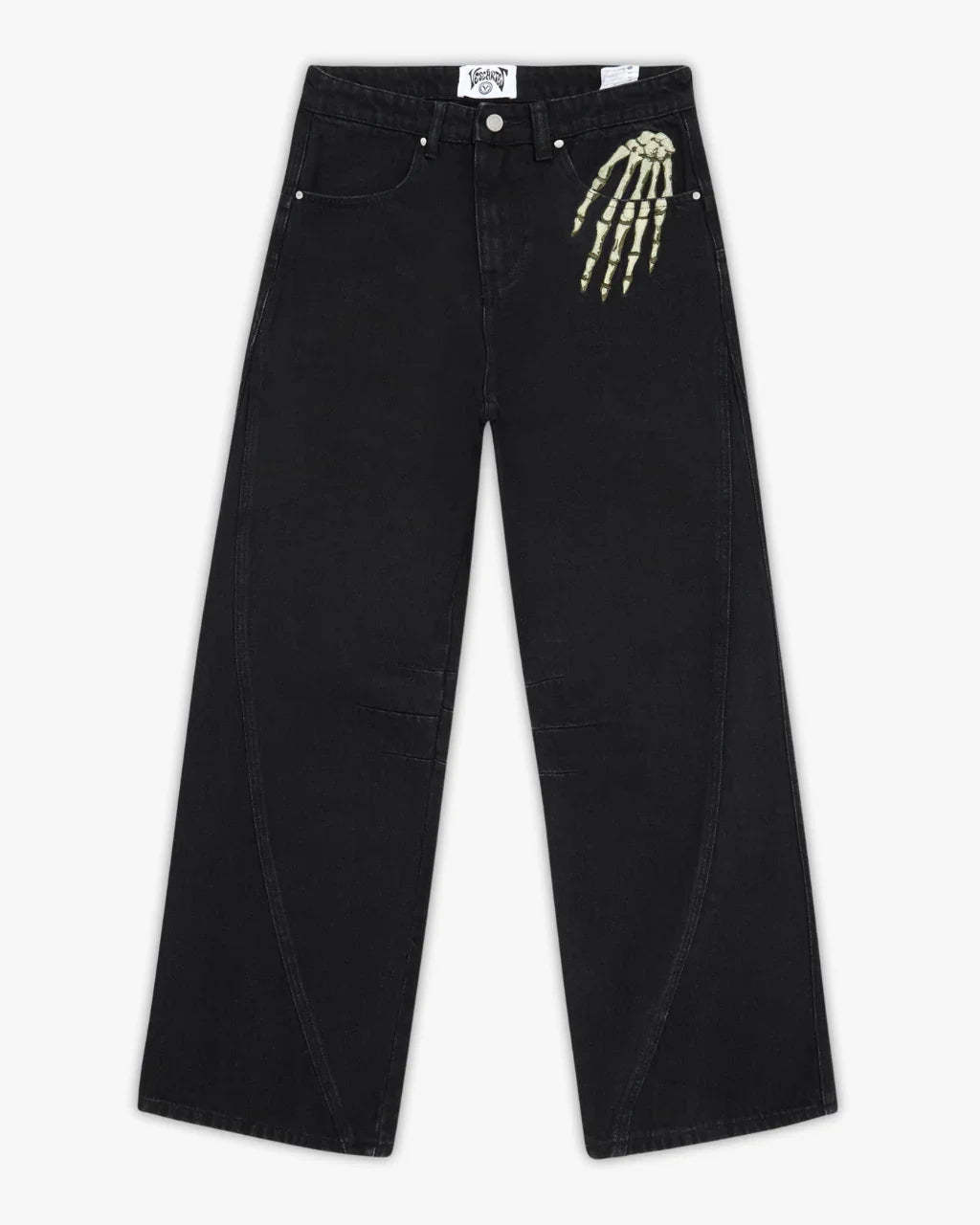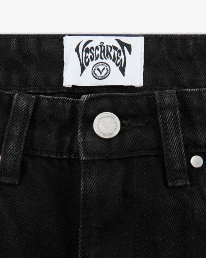Jet-black denim subtly faded for a worn-in look. The front left pocket carries an intricate skeleton hand embroidery. The back features dual pocket embroidery inspired by Van Gogh and spells ‘Vescartes’ in the drifting smoke. Finished with custom front and back panel construction and our signature metal hardware.