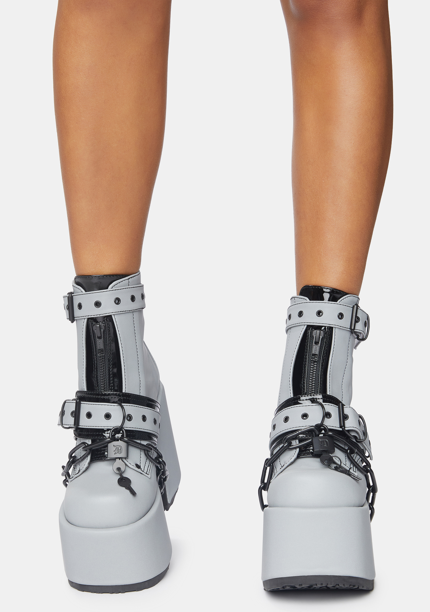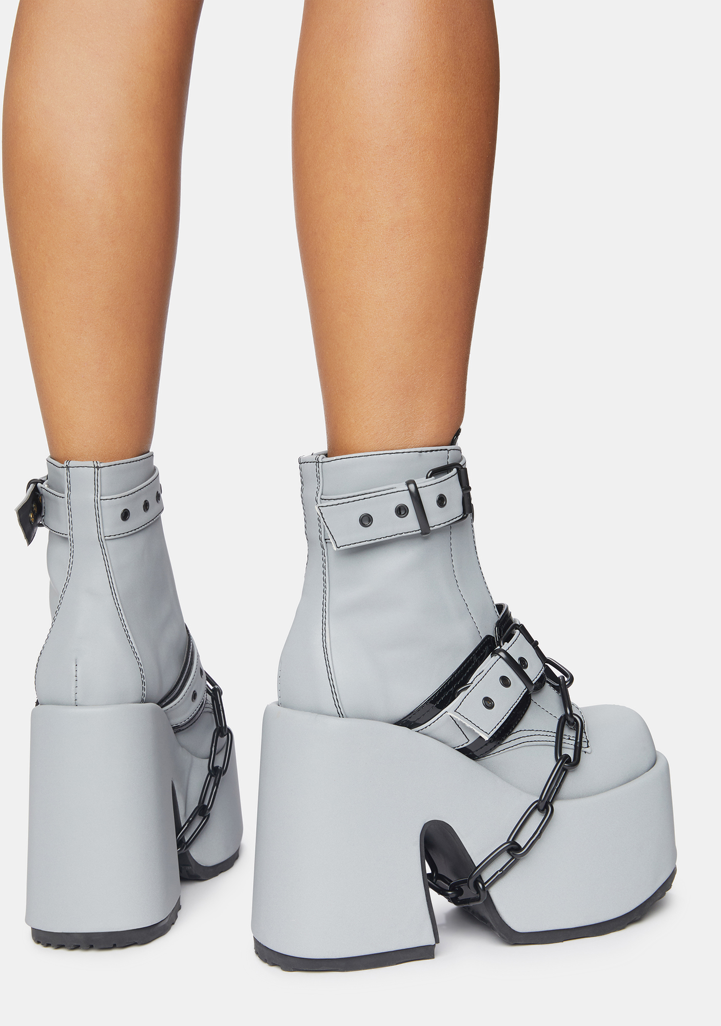 Glow In The Dark Ruin My Life Platform Ankle Boots burn it all to the ground! These platform ankle boots have a glow in the dark construction, eyelet buckle straps, chain detailing, chunky heels and front zip closures.
