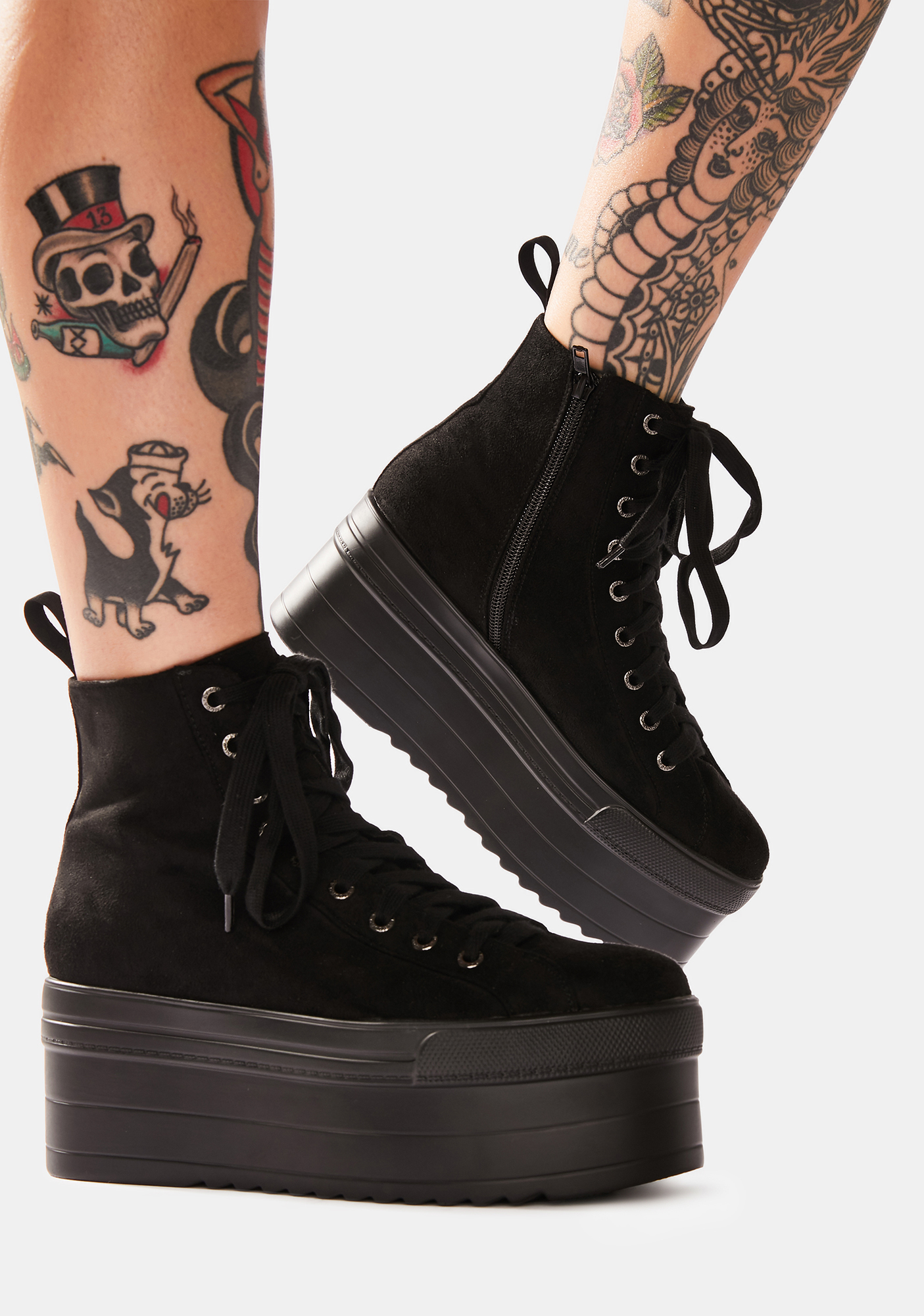Star Struck Chunky Flatform Sneakers features a chunky platform treaded sole, front lace up detail, side zip closure, and faux suede construction.